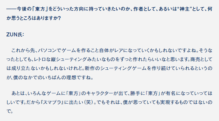 このインタビューで特に話題になったのは、東方の商業展開に関して「勝手に『東方』が有名になっていってほしいです。だから『スマブラ』に出たい(笑)」とZUNさんが語ったところ。