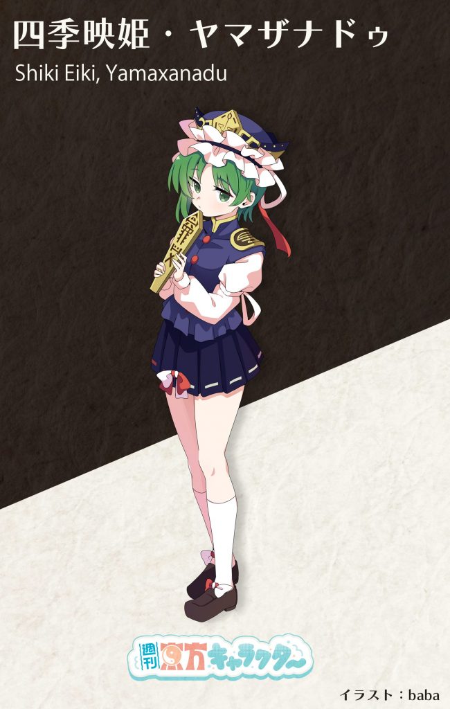 幻想郷の地域を担当する閻魔の映姫。ヤマザナドゥは役職名であり、ヤマは閻魔を、ザナドゥは楽園を表しています。これは映姫の二つ名でもある「楽園の最高裁判長」を意味します。