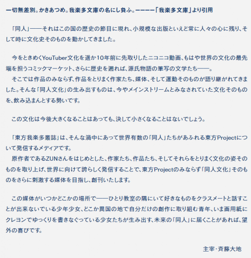 ――東方我楽多叢誌には、創刊当初から載せている主催の言葉があるんです。「ひとり教室の隅にいて、好きなものをクラスメートと話すことができないでいる少年少女たちが生み出す、未来の『同人』に届くことがあれば、望外の喜びです」。サブカルには、東方には、そういう子たちの救いであってほしい。なぜなら、僕たちもそうであったから……というのは、東方我楽多叢誌編集部が常に念頭に置いていることなんです。あなたが「東方が好き」ということは、いつだって言い張っていいことなんだ。それは誰にも邪魔できないし、同じことを考えている人たち、同人の仲間はいっぱいいるんだよ――そういうことを伝えるために作られたメディアなので。