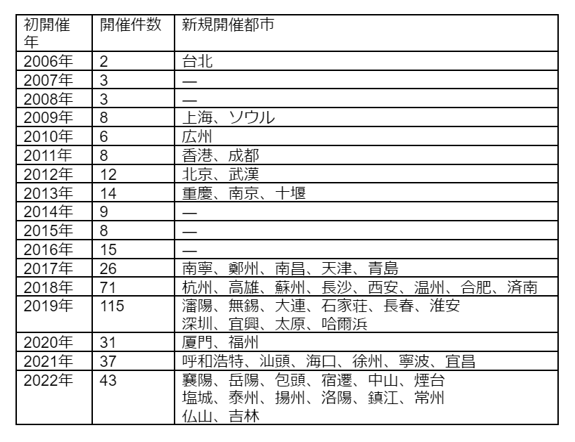 上海THOの初開催以降、2010年代前半の中国大陸では広州・成都など、オールジャンル同人イベントの基盤があった地域で比較的早く東方イベントが発足し、他に北京・武漢・重慶・南京など大都市で開催が積み重ねられました。2010年代後半になると、地方都市のTHO開催が急速に拡大しました。下記の表は、東アジア全体の東方関連ファンイベント(即売会・交流会・音楽ライブなど)の開催件数および都市別の初開催年をまとめたものです。この表からは、私が上海THOに初参加した2015年のイベント開催数は8件であり、一時的な停滞期であったことが分かります。2016年以降、特に中国大陸で東方関連ファンイベントの爆発的な増加が始まり、2019年には東アジア全体で115件にまで達しました。
