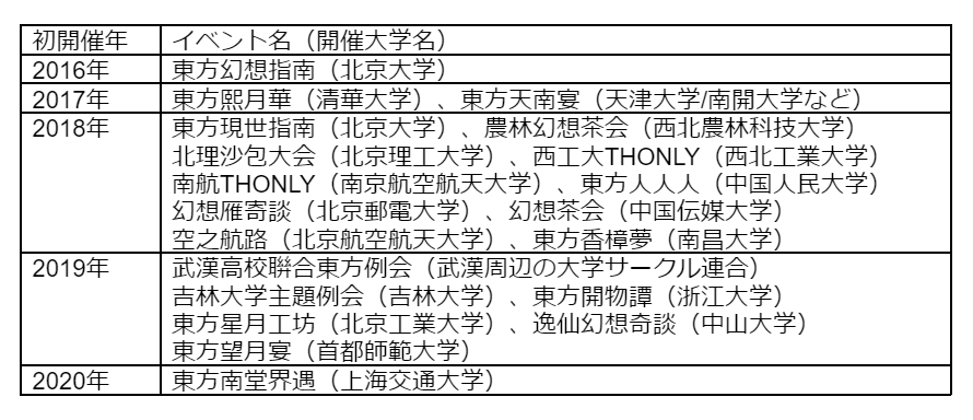 THB wikiの東方イベント日程表を確認すると、同人作品を頒布するマーケット型の「展会」に加えて、2016年以降は交流会型の「聚会」の開催件数が多いことに気づきます。さらに詳しく見ると、聚会には地域の有志が開催するパターンと、大学を会場として開催するパターンがあるようです。前者は地域系聚会、後者は大学系聚会と呼ぶことができそうです。