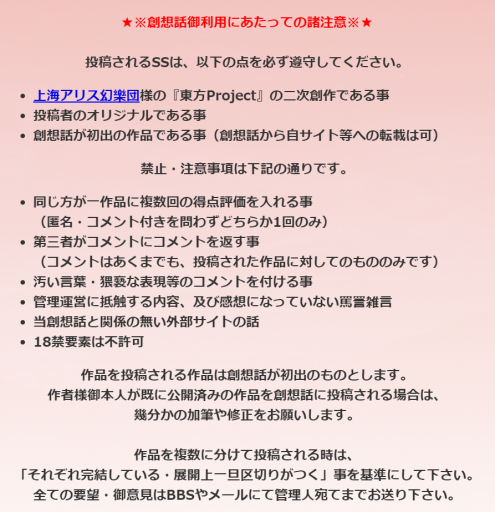ただ、こういう創想話のルールっていくつかサイトには載せてるんですけど、あんまり線引きをきっちりしていないんですよね。そこを線引きしてしまうと、その通りにやんなきゃいけなくなるので。それでその辺を曖昧にしてるんです。