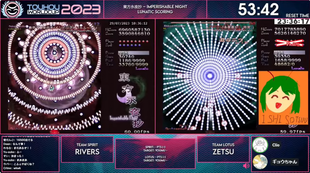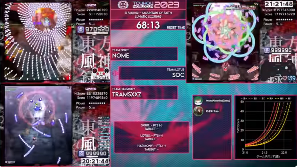 輝針城のスコアアタックで東方プレイヤー、というかもはや研究者のような方がいるんですけど。その方がとんでもないTWCスコアを出して試合をぶっ壊していった、なんて部門もありました。大会そのものに慣れてきた人も多いですね……別に大会でLNMNB出してる人が慣れてきた人ってわけでもないんだよな。