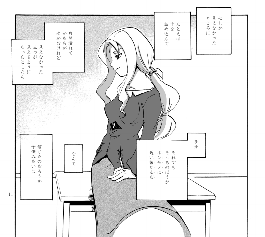 いや、単純にめちゃくちゃ面白いというのも勿論ある。言葉選びのセンスやキャラクターの心情描写の仕方は神がかっていて、世界の描き方の美しさに涙することもある。それは『東方怪弾七』に限らないので、ALL.さんが描いたほかの同人誌もぜひ読んでほしい。