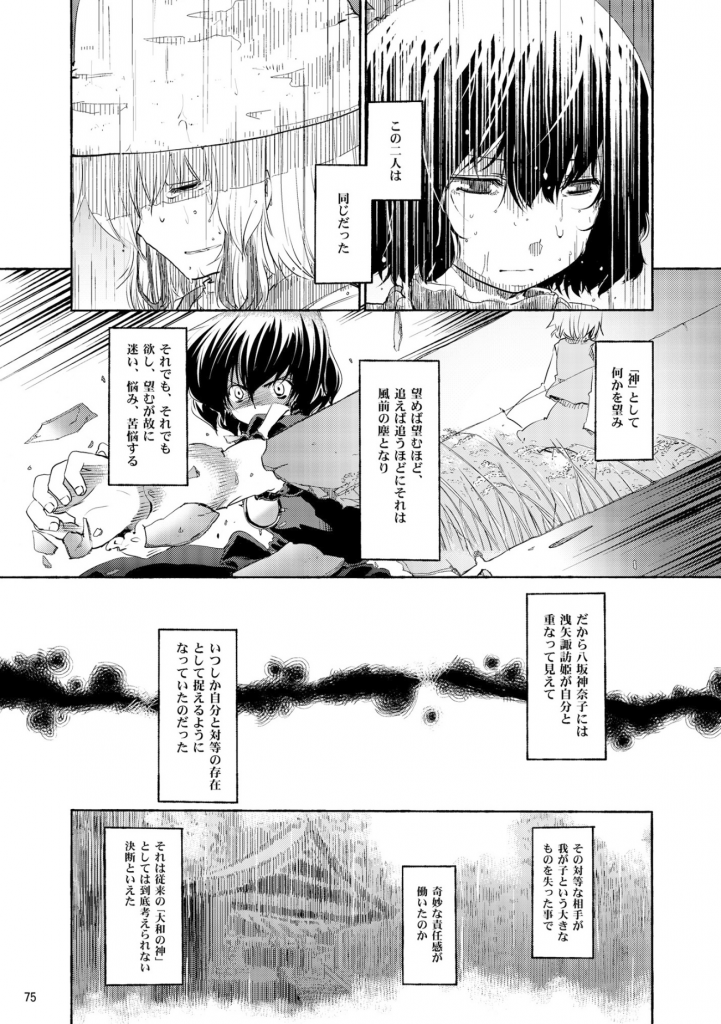 東風谷早苗、八坂神奈子、洩矢諏訪子。バラバラな生い立ちの彼女たちがなぜ「守矢一家」とも称されるような深い絆で結ばれるに至ったか。早苗はなぜ「外の生活」の人生を完全に捨て、幻想郷で生きる道を選んだのか。