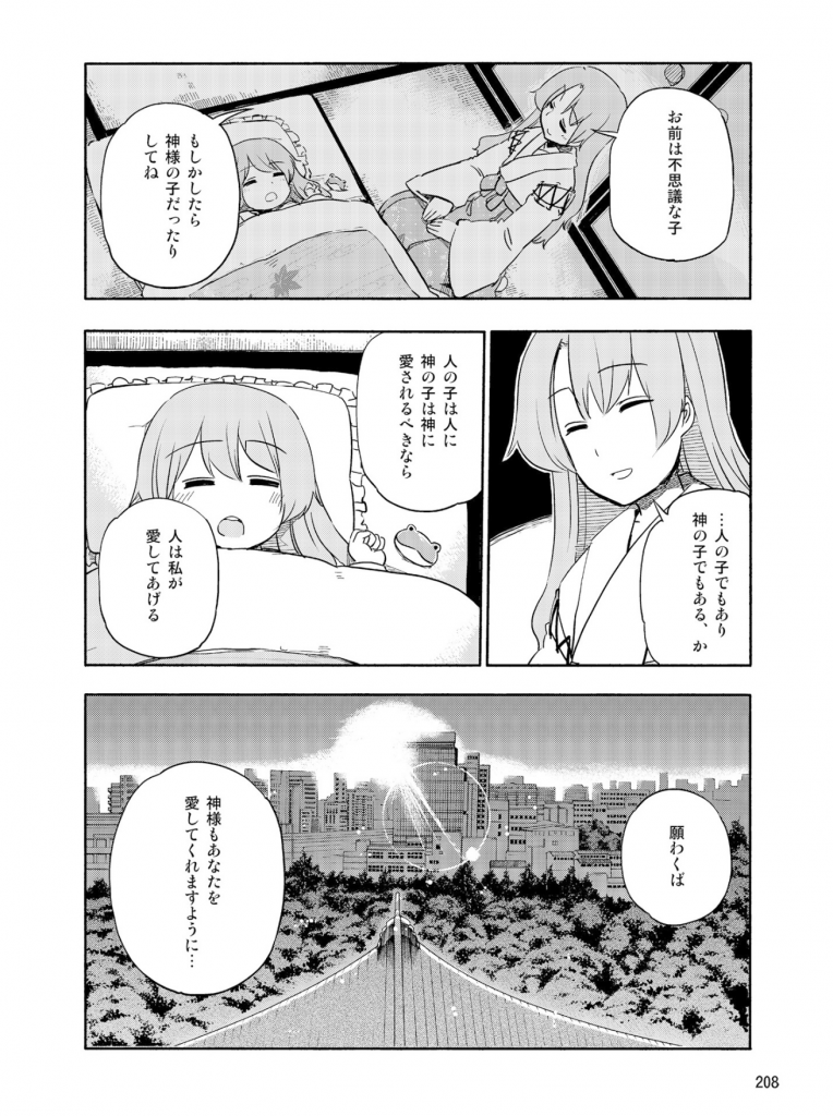 諏訪子と神奈子も「神」というプライドやしがらみから解き放たれ、自由な存在になっているんですよね。その二柱が「変わって良いんだ」と気づくのは、早苗の真っ直ぐな言動に感化されたこともあるでしょう。本作でもエピローグ的な部分で、そうした変わった様子を伺い知ることができます。ひょっとしたら二柱の考えを変えた瞬間こそが、早苗が持つ「奇跡を起こす程度の能力」が本当に開花したタイミングだったのかもしれませんね。
