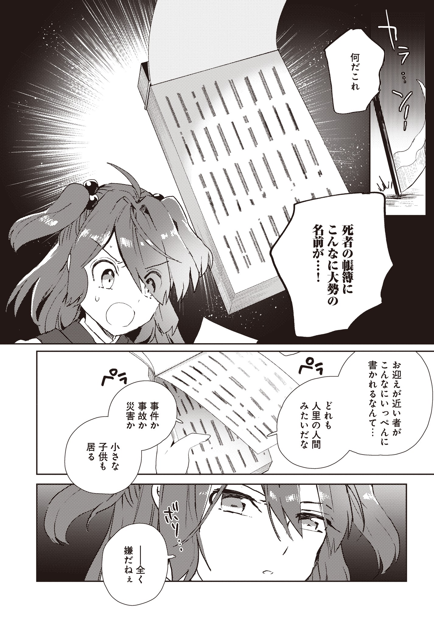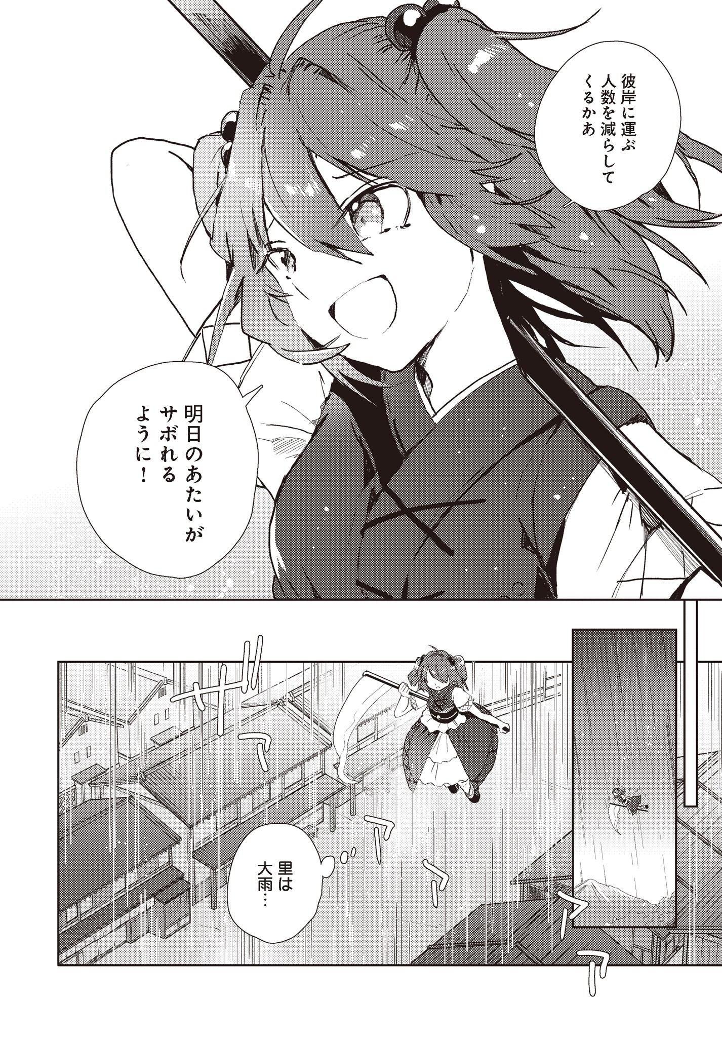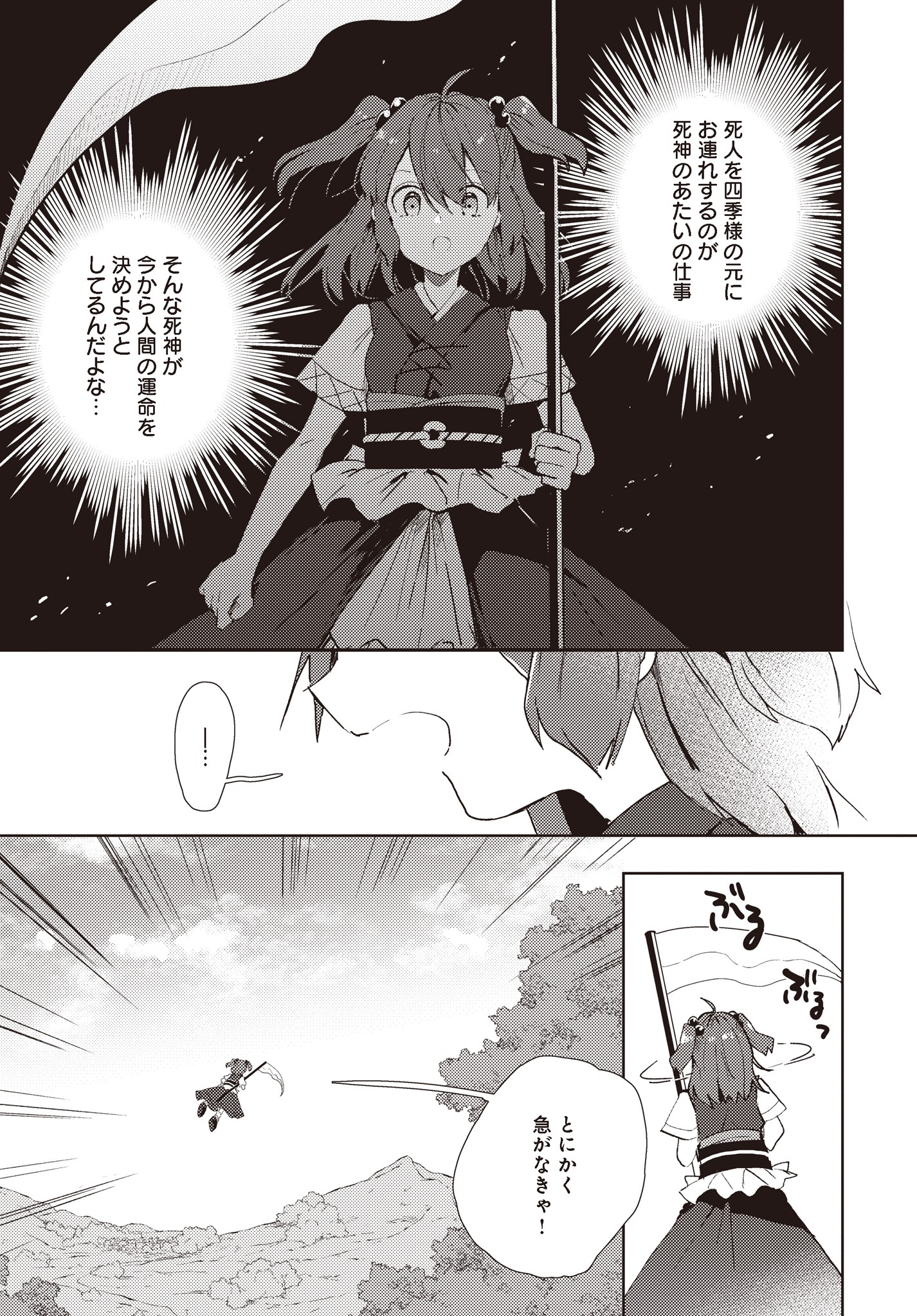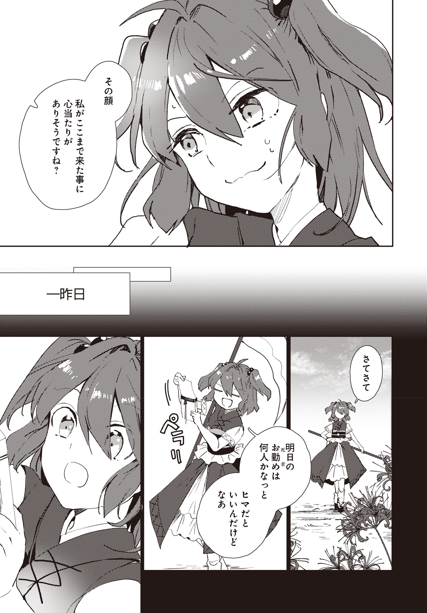 幻想郷を担当する死神・小野塚小町は、どちらかというと職務熱心ではなかった。今日も今日とて上司の閻魔様・映姫から隠れてのんびりしていたが、そうともばかりしていられず・・・。