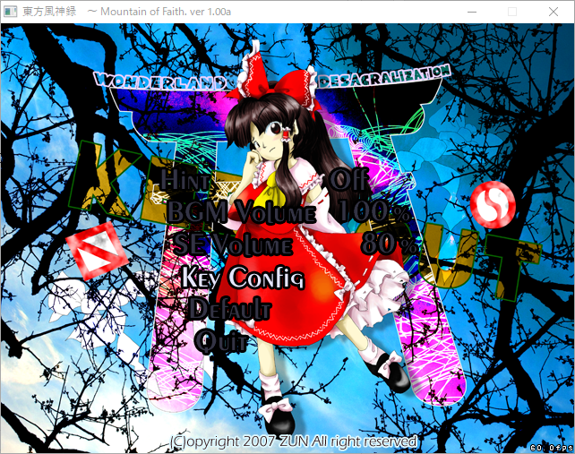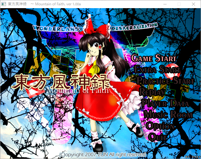 この記事で最初に遊ぶタイトルとして選んだのは「東方風神録 ~ Mountain of Faith.」です。インストールが完了したら、ゲームを起動してみましょう。メニューの各項目を解説します。