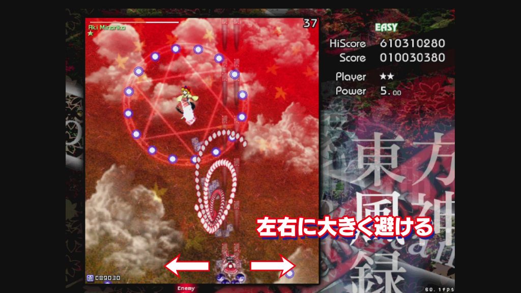 ポイントは、避けようと思っている弾に対して、垂直で避けるように意識すること! 無理に動かずに「これ霊夢の目の前に来るぞ~」って弾にだけ集中。