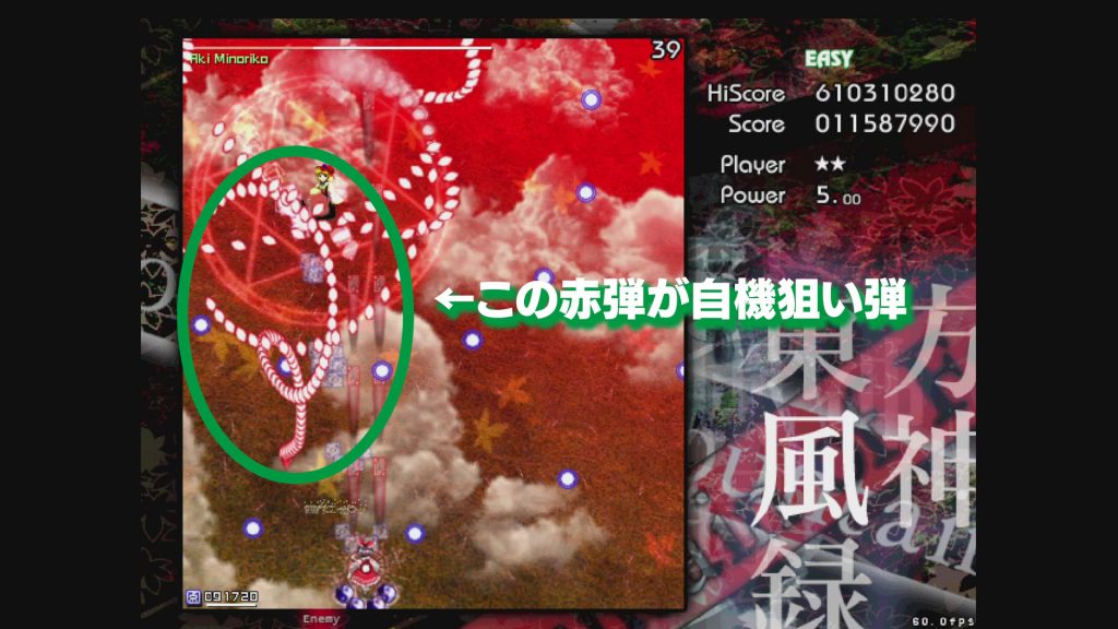 霊夢の近くに来る弾だけ見るようにしましょう。静葉さんと霊夢の中間ぐらいから下を見るようにすると、霊夢に向かって来る弾が見やすいです。