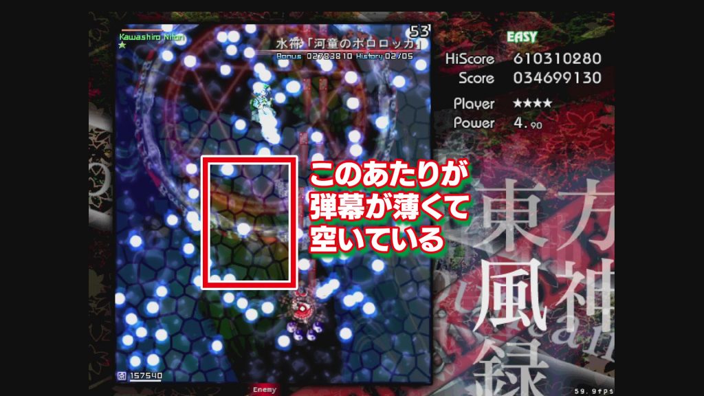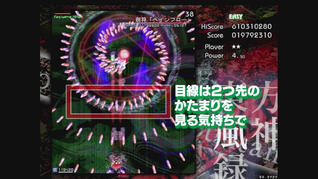 ボムを撃ちたくない人は、これも霊夢のすこし前に目線を置いて、弾が少ないところに移動していくイメージで。