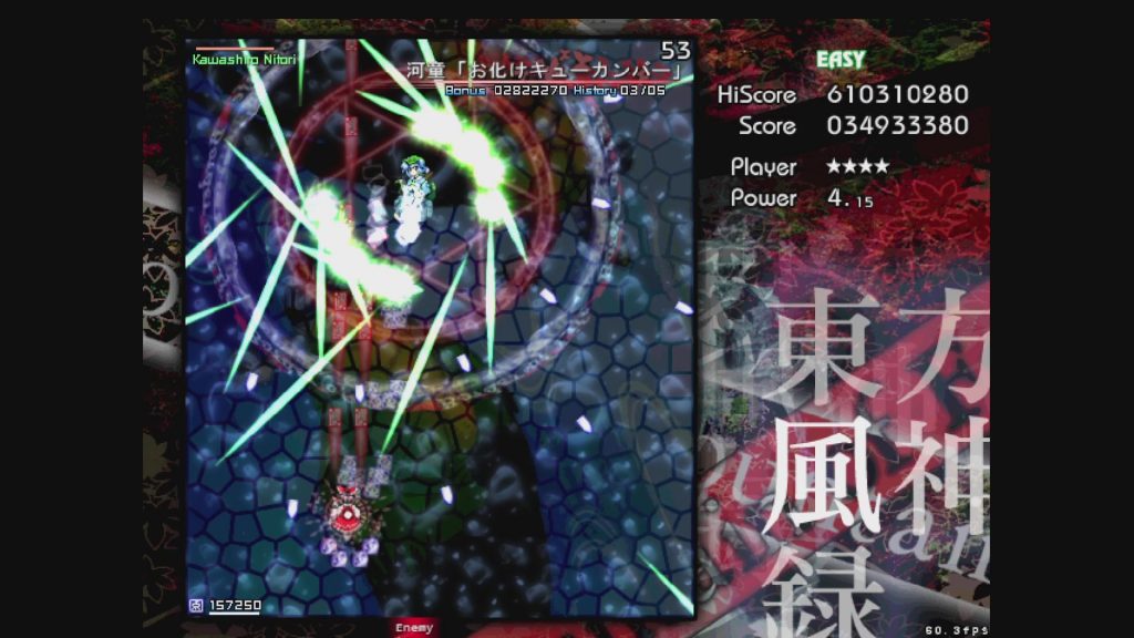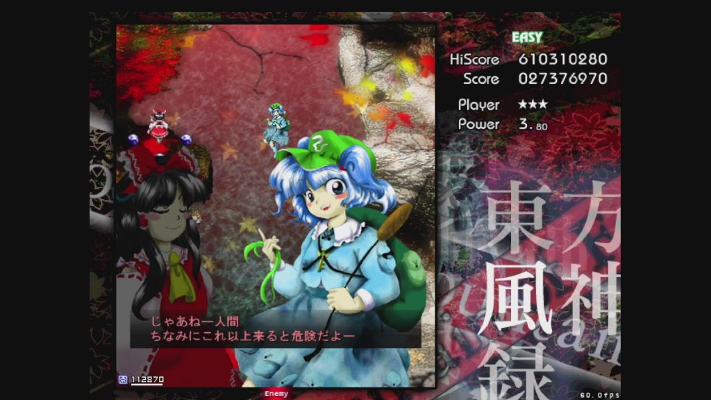 さらっと解説していますが、東方はEasyでも、いきなりプレイして3面まで到達できるだけで相当すごいです。なので途中でGAME OVERになってしまったり、何度プレイしてもにとりが倒せないのも、普通です。