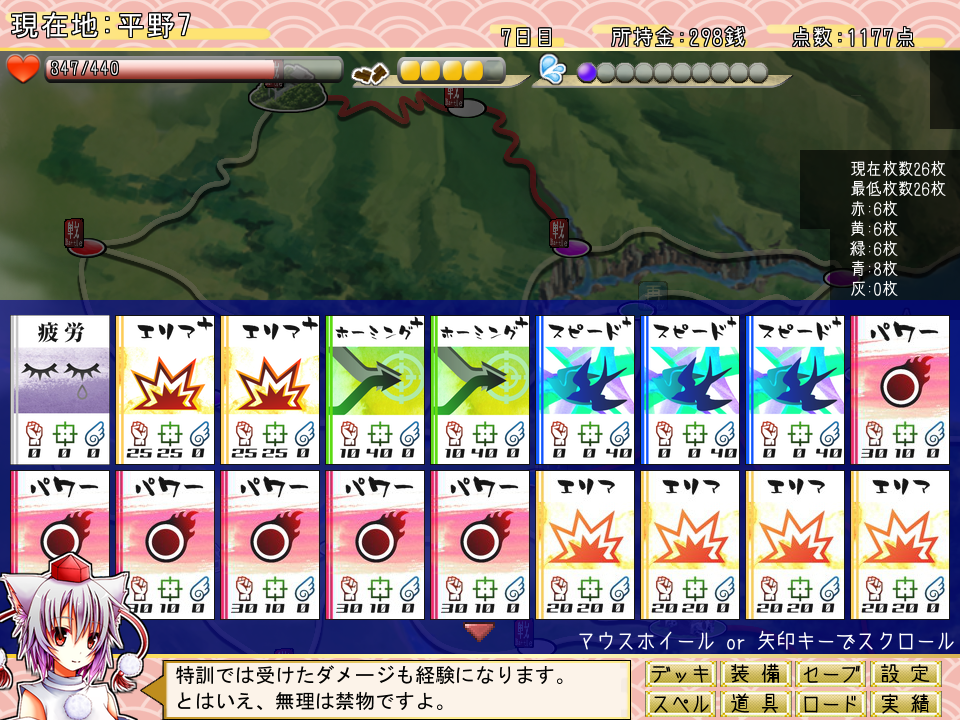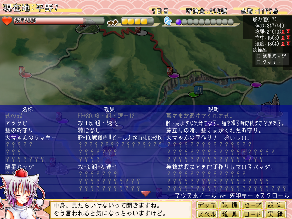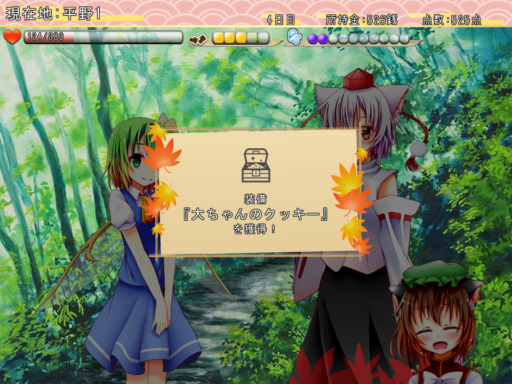 他にも、スペルカードや装備、道具といった旅をサポートするアイテムが入手できる場合もあります。更には一度出会ったキャラクターが居る場所にもう一度足を運ぶことで、今度はまた違ったイベントが発生することもあったりと、豊富なバリエーションでプレイヤーを楽しませてくれます!