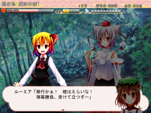 孤独にスタートする橙の厳しい修行の旅ですが、開始早々に出会える心強い旅の同行者「犬走 椛」の存在によって、楽しく賑やかな旅が待っています!