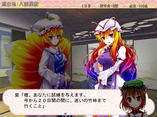 橙の主人である「八雲 藍」、その橙の主人の主人「八雲 紫」に、一人前の式として認めてもらうため、「式の力を使わず20日間以内に迷いの竹林まで辿り着く」という課題にチャレンジするのが、本作の目的となっています。