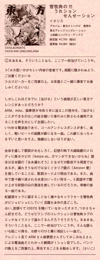 『東方オトハナビ』全曲レビュー 「菅牧典の!!!うれションせんせーション/IOSYS」