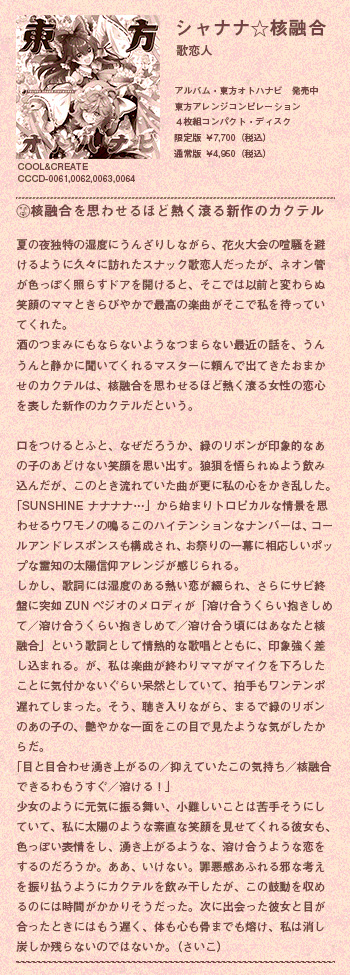 花火大会の喧騒を避けるように訪れたスナック歌恋人。出てきたのは、熱く滾る女性の恋心を表した新作のカクテルだ。『東方オトハナビ』全曲レビュー!! Disc3-06『シャナナ☆核融合/歌恋人』