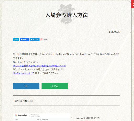 下記、例大祭のホームページに「入場券の購入方法」がまとめられています。Livepocketでチケットを購入したことがない人にも分かりやすい内容になっておりますので、購入される方はぜひ御覧ください。