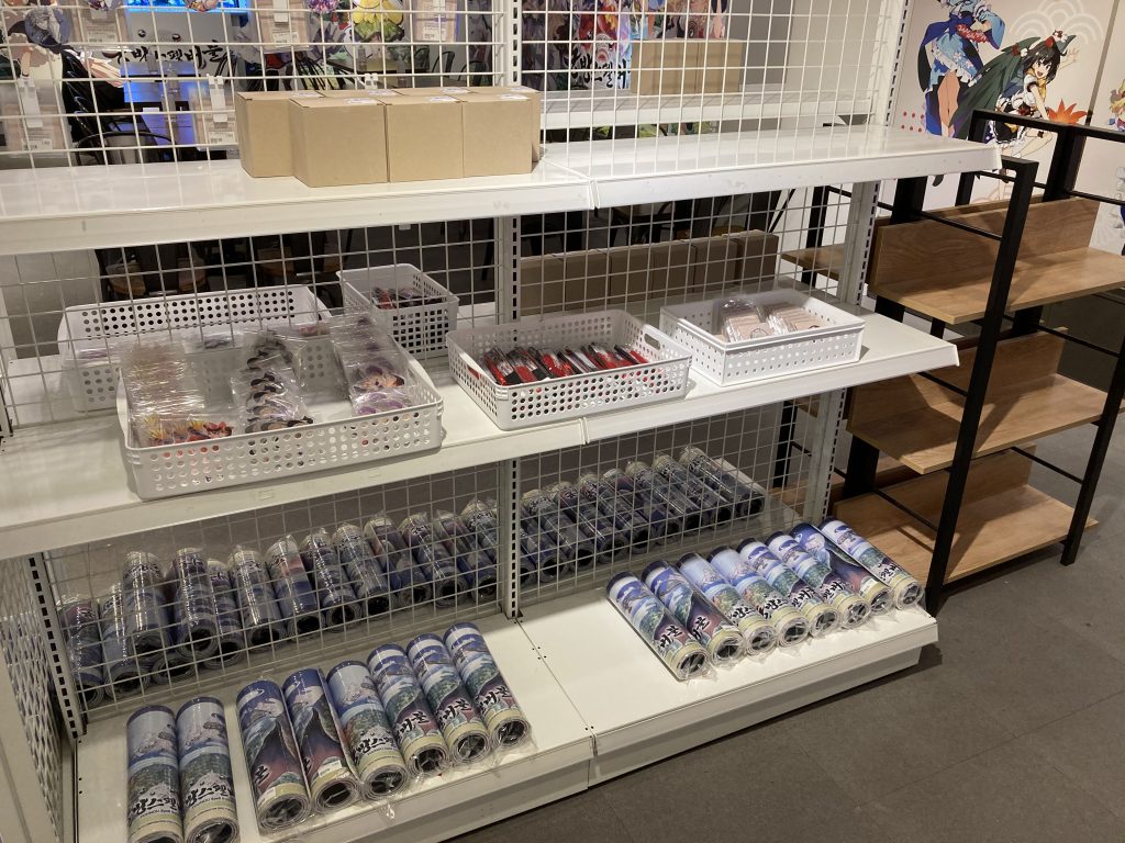 カフェの内装は『東方スペルバブル』の流麗なイラストで飾られていて、実際に遊べる空間も設置されていました。もちろん、コラボイベントには外せないグッズも充実。ゲーム本編はもちろん、マウスパッド、うちわ、バッテリーなど、さまざまな種類のグッズがありました。