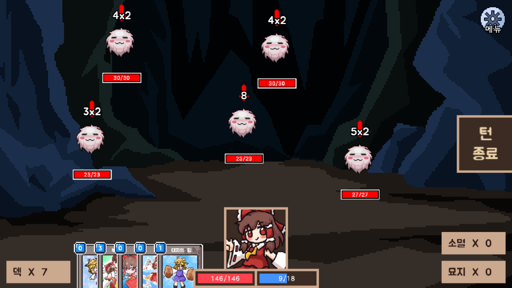 戦闘に突入すると5枚のカードが与えられ、そのカードたちを適切に使いこなして敵を倒したり、敵の攻撃を最小限の被害で乗り越えるのが基本です。そうやってターンを過ごしながら敵を全部倒すと勝利します。