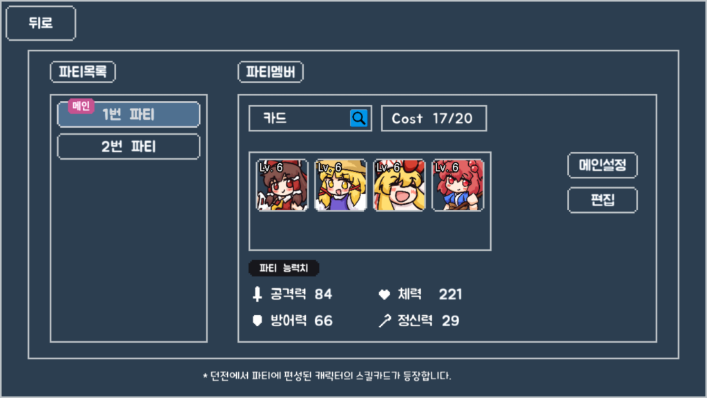 「東方花闘伝」は、ローグライト(ローグライクの派生系ジャンル)の中でも、デッキビルドの形式を持つゲームです。既存のゲームで似たようなゲームを挙げると「Slay the Spire」や「クロノアーク(크로노아크)」などがあるでしょう。キャラクターを選択してそのキャラのカード(スキル)を駆使して戦闘を切り抜けるゲームです。