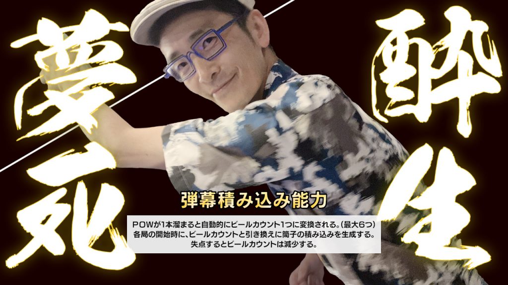 ZUNさんの能力は、ツモごとに溜まるPOWをビールカウントに変換し、それが毎局ピンズの積み込みに化ける「弾幕積み込み能力」。キャラクター(?)画像、カットインはすべて『東方幻想麻雀』のための撮り下ろしです。