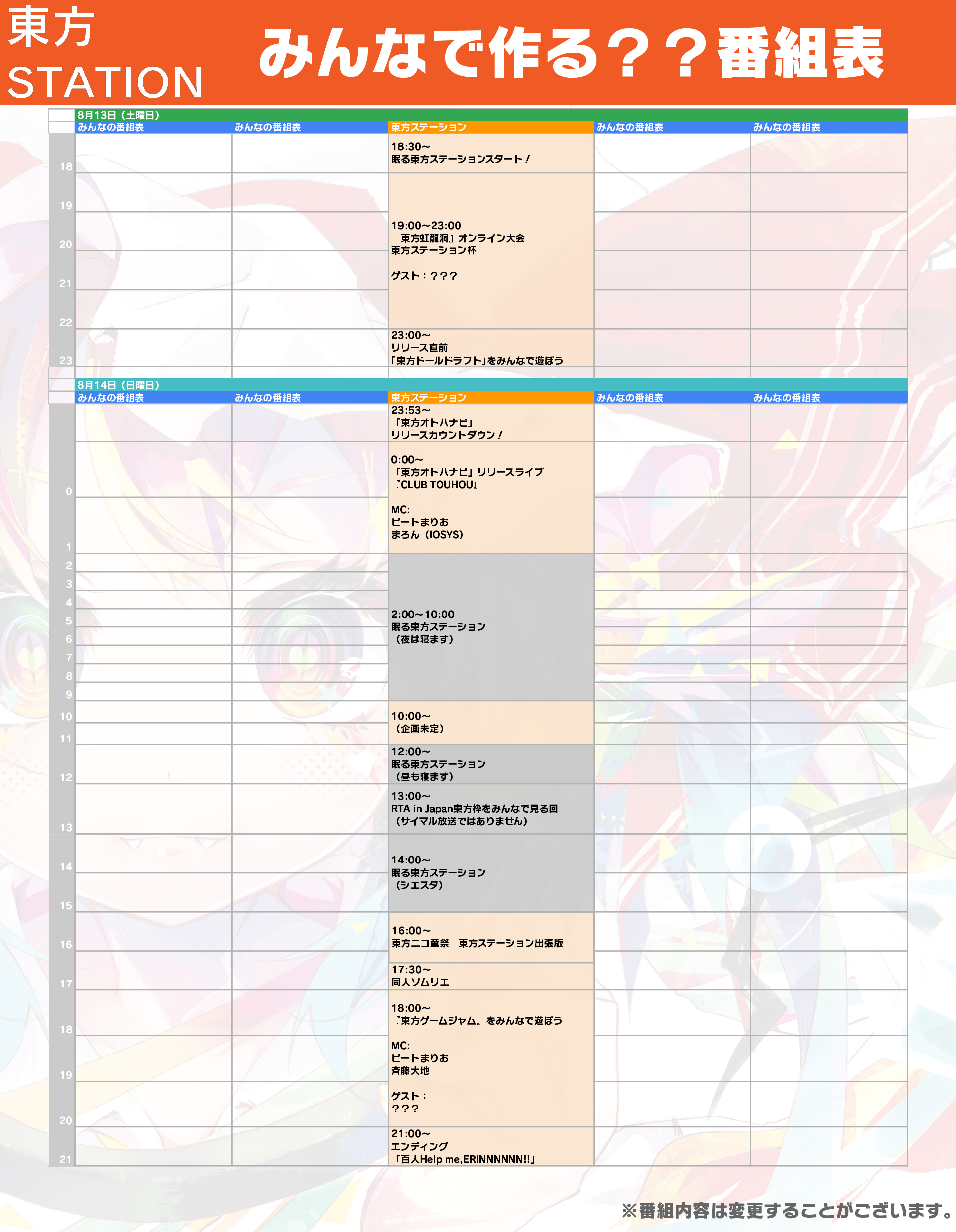 次回、東方ステーションは2日間特番!8/13-14放送「眠る??時間東方ステーション」! 「みんなで作る??番組表」&「百人Help me,ERINNNNNN!!動画」募集のお知らせ