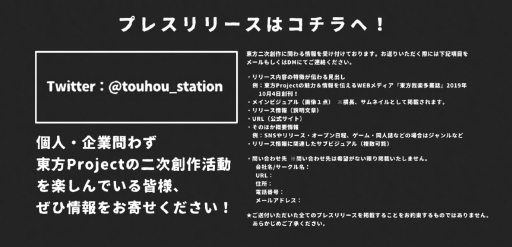 東方我楽多叢誌では、サークル・イベント・企業を問わず、東方でなにか告知をしたい方からの情報をお待ちしております!