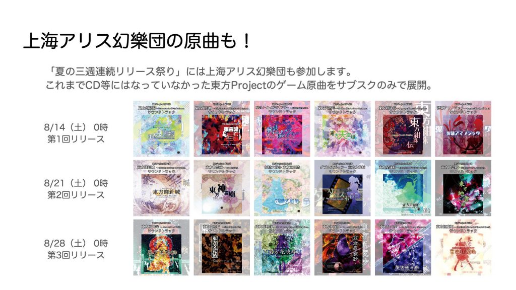 8月14日・21日・28日「東方同人音楽流通 夏の三週連続リリース祭り」では、新規タイトルの配信が三週連続に渡って行われたり、今回の新規配信作品がどんなサービスで配信されているか、購入先/視聴URLが分かる特設サイトがオープンされます。特設サイトは8月2日にオープン予定です。