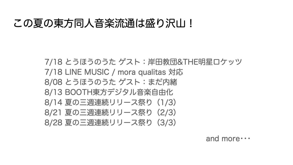来週末、そして8月にも行われる配信番組「とうほうのうた」を含めて、夏の東方同人音楽流通は企画が目白押し!今までに見たことのない「東方の夏」になりそうです!