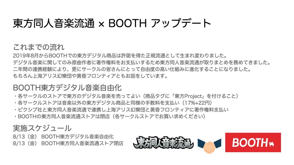 といった方針が出ています。また、これにより今まであった「東方同人音楽流通 BOOTH店」は閉店となるとのこと。