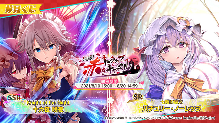 本夢見くじには、SSRミタマカード「[Knight of the Night]十六夜 咲夜」、SRミタマカード「[七曜の魔女]パチュリー・ノーレッジ」が登場しました。