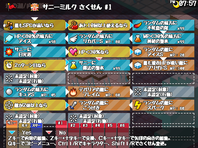 「どのような状況で」→「誰に」→「何をするか」という“さくせん”をあらかじめ組むことで、それに従って三妖精は自動で戦ってくれます。頭の弱い三妖精の代わりに戦況に応じた綿密な“さくせん”を組んで、戦闘をサクサク楽しく進めましょう。