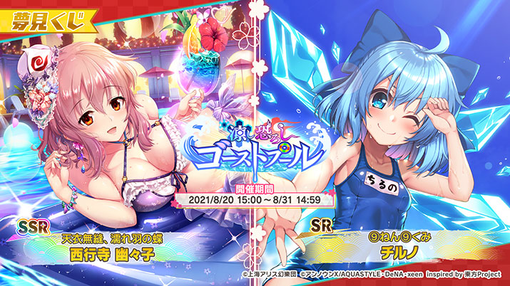 ※予定は予告なく変更することがあります。夢見くじ「涼し恐ろしゴーストプール」に水着姿のSSR「西行寺 幽々子」やSR「チルノ」が登場!
