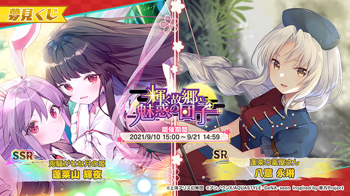※予定は予告なく変更することがあります。夢見くじ「輝く故郷と魅惑の団子」にSSR「蓬莱山輝夜」と、SR「八意永琳」が登場!