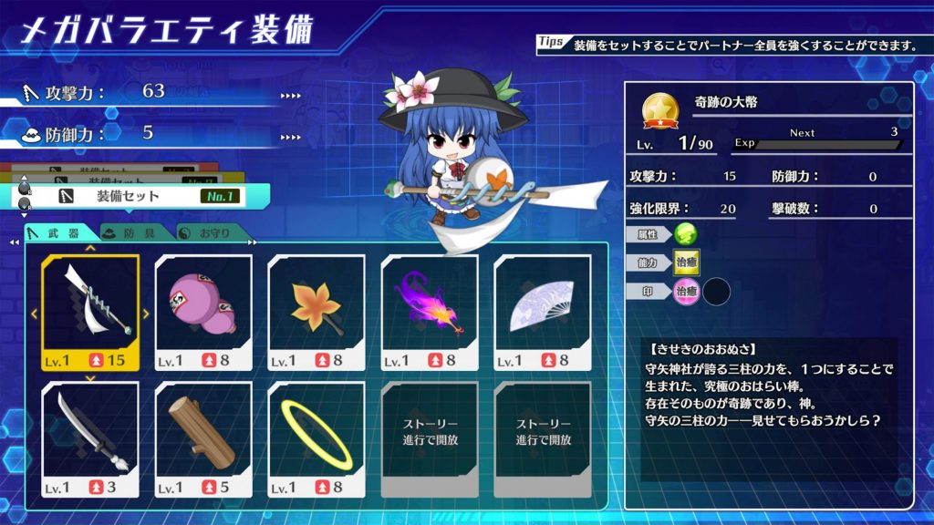 武器・防具・お守りの装備品はそれぞれ同時に最大10個まで装備が可能。装備による増強効果はプレイヤーだけではなく、パーティーメンバー全体へも付与され強化がされます。プレイヤーの性能だけでなく、パートナーたち全体の個性や弱点を考え補える形で装備を選んでいこう!