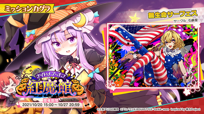 また、同時に、イベント「ナイトメア・オブ・紅魔館」を開始しました。本イベントに合わせて、楽曲「無生命サーフェス」がプレイ可能になるほか、本作初参戦となる「クラウンピース」が、ハロウィン仕様のミタマカードで登場する夢見くじ(ガチャ)「トリック・オア・焼き討ち!?」を開催中です。