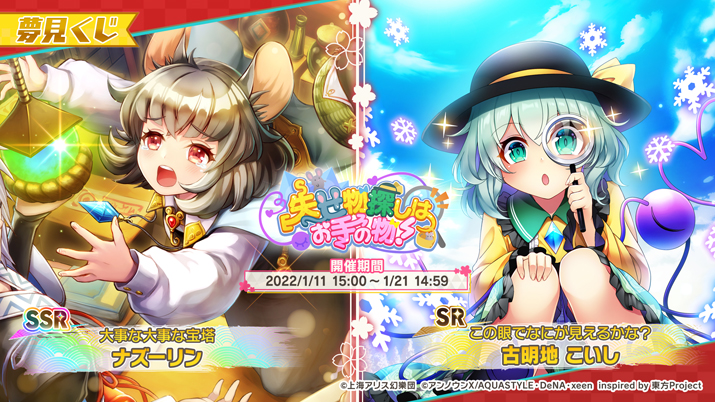 イベントに合わせて、夢見くじ「失せ物探しはお手の物!」を開催中です。本夢見くじに、SSRミタマカード「[大事な大事な宝塔]ナズーリン」、SRミタマカード「[この眼でなにが見えるかな?] 古明地 こいし」が登場しました。なお、「ナズーリン」は、本作で初登場です。また、本夢見くじでは、新ミタマカード2枚の提供割合が同レアリティのミタマカードと比較してアップしています。