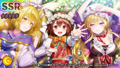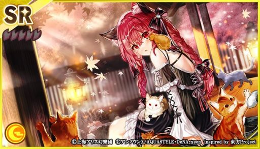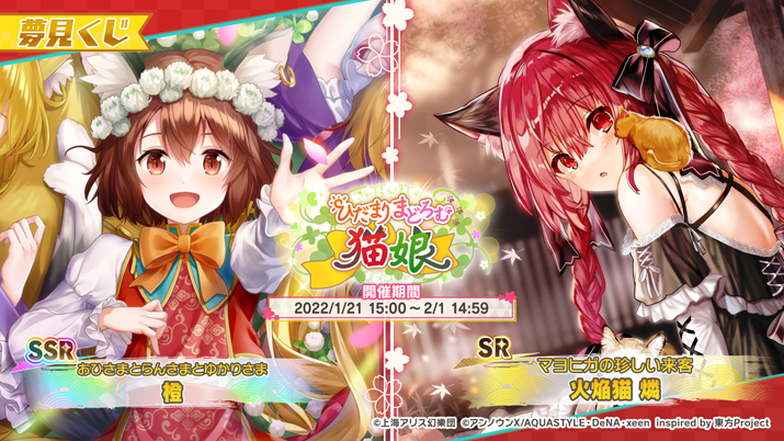 本夢見くじに、SSRミタマカード「[おひさまとらんさまとゆかりさま]橙」、SRミタマカード「[マヨヒガの珍しい来客]火焔猫燐」が登場しました。なお、「橙」は、本作で初登場です。また、本夢見くじでは、新ミタマカード2枚の提供割合が同レアリティのミタマカードと比較してアップしています。
