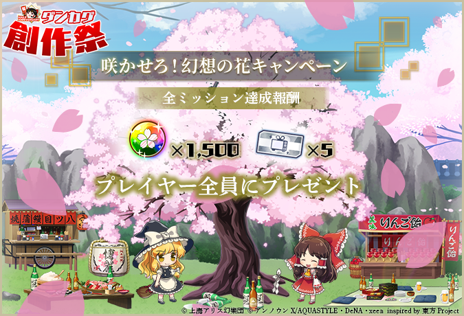 ハーフアニバーサリー記念企画「ダンカグ創作祭」に合わせて実施した、「咲かせろ!幻想の花キャンペーン」について、すべてのミッションをクリアした報酬として、すべてのプレイヤーに「御霊石」1,500個と「夢見くじ券」5枚をプレゼントします。