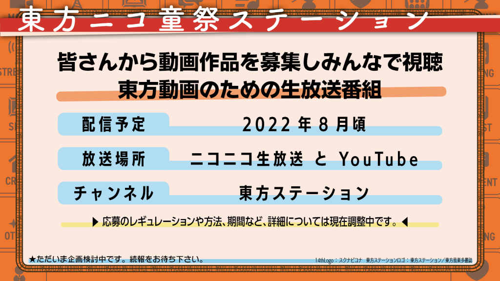 また、『東方ステーション』と『東方ニコ童祭』とのコラボ放送企画も同時に発表されました。こちらの放送は8月ごろの配信を予定しており、企画内容や参加方法については、後日発表予定となっています。