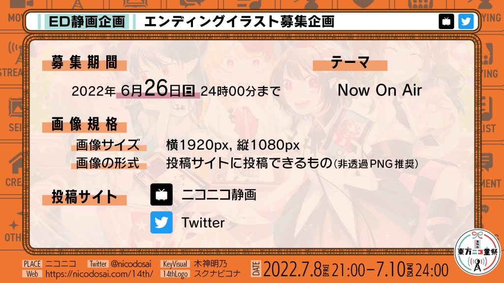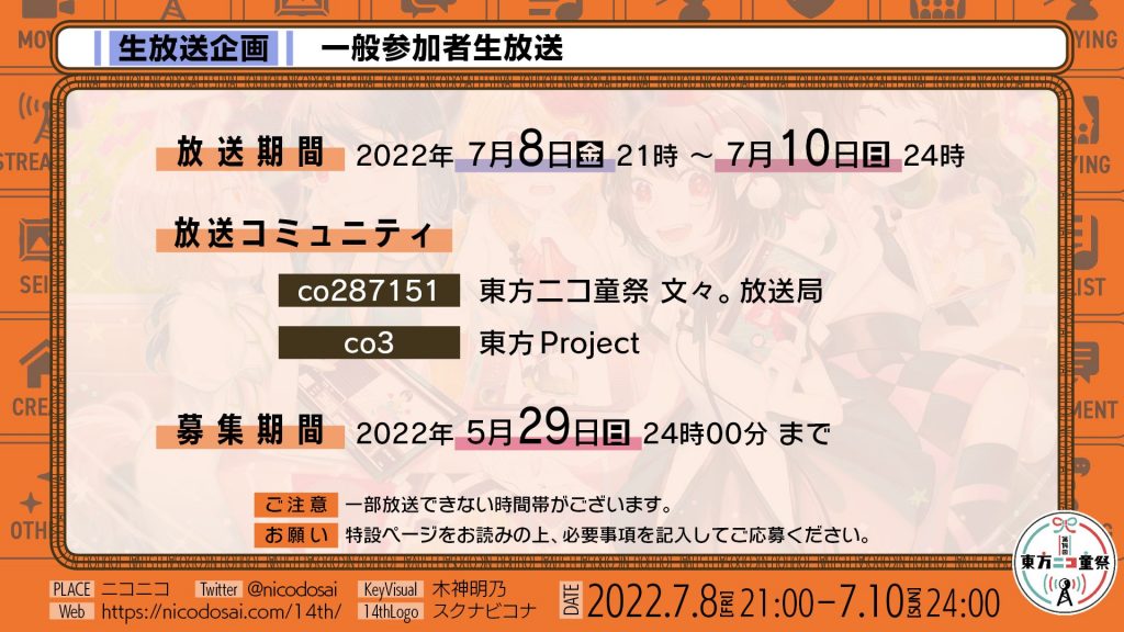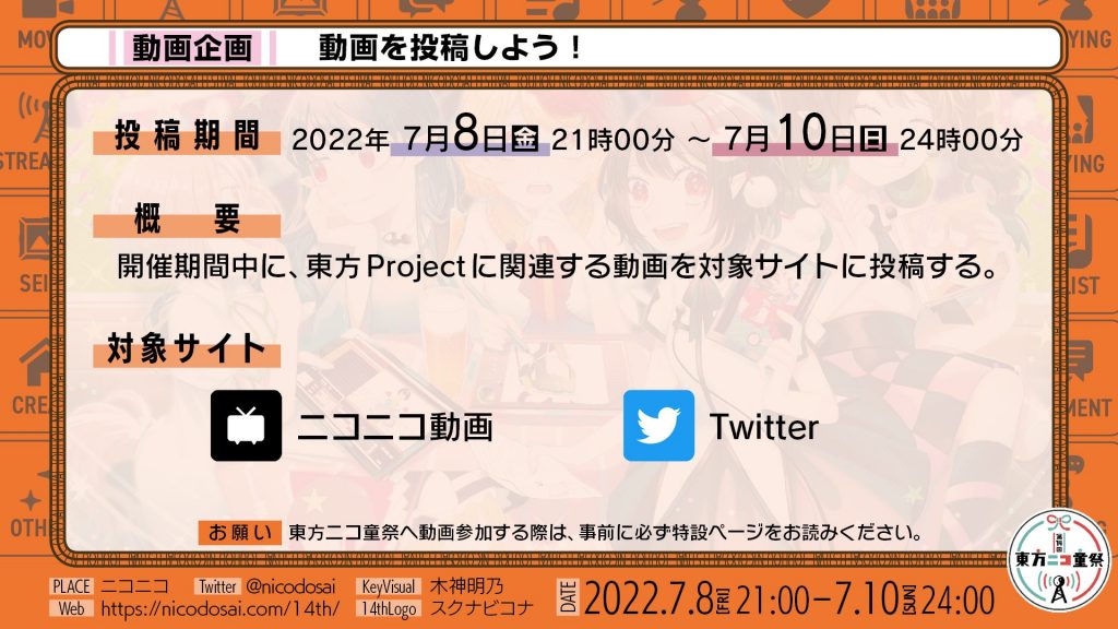 東方ニコ童祭は従来通り「第14回東方ニコ童祭」を実施し、その後8月頃に共同で東方動画の為の長時間生放送を実施する予定です。