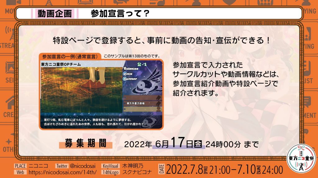宣言を行っていただいた方は、東方ニコ童祭運営から投稿される動画や特設サイト等々、様々な場所でご紹介いたします。
