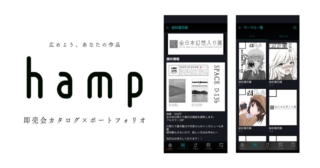 即売会主催者様のご協力を得て、幻想入り展アプリはwebカタログサービスとして進化をすることになりました。コンセプトは「即売会カタログ×ポートフォリオ」から「カタログフォリオ hamp」ということで、サークル参加をされている作家さん自身がページを持ち、その中で頒布情報やメディア、作品などを掲載することが可能なサービスです。