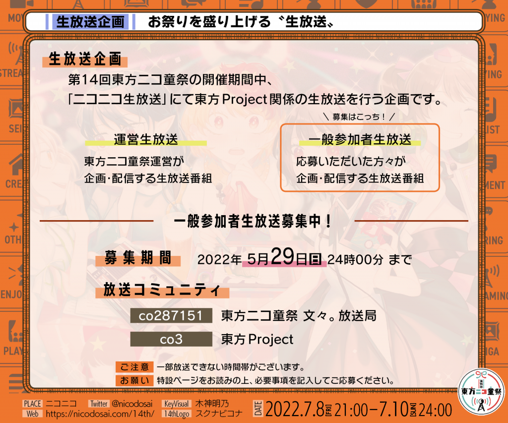 今年は「co287151/東方ニコ童祭 文々。放送局」と「co3/東方Project」コミュニティにて放送いたします。