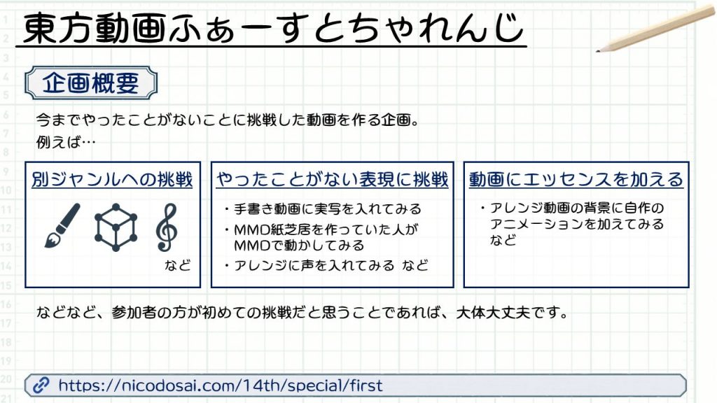 もう一つ、『東方動画ふぁーすとちゃれんじ』。今までやったことがない初めての事を行うあなたを応援します!