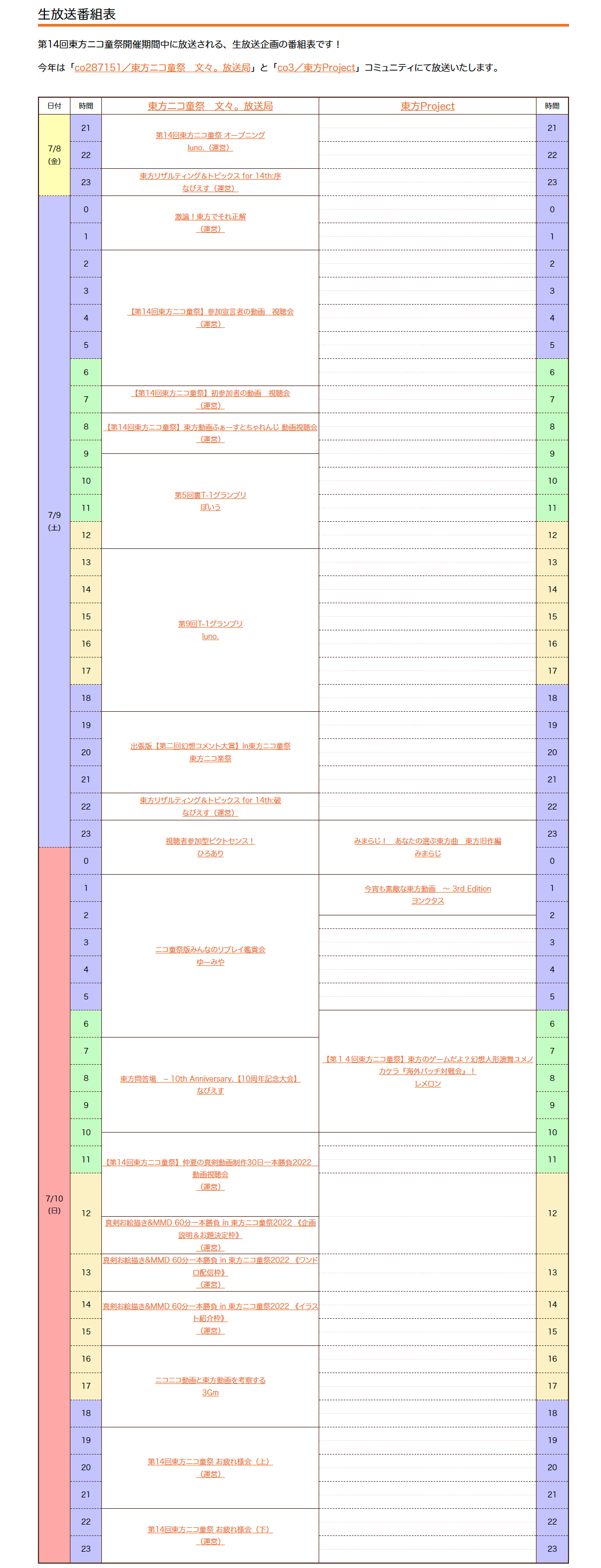 第14回東方ニコ童祭 生放送番組表(公式サイトより引用) 真剣お絵描き&MMD 60分一本勝負 in 東方ニコ童祭2022