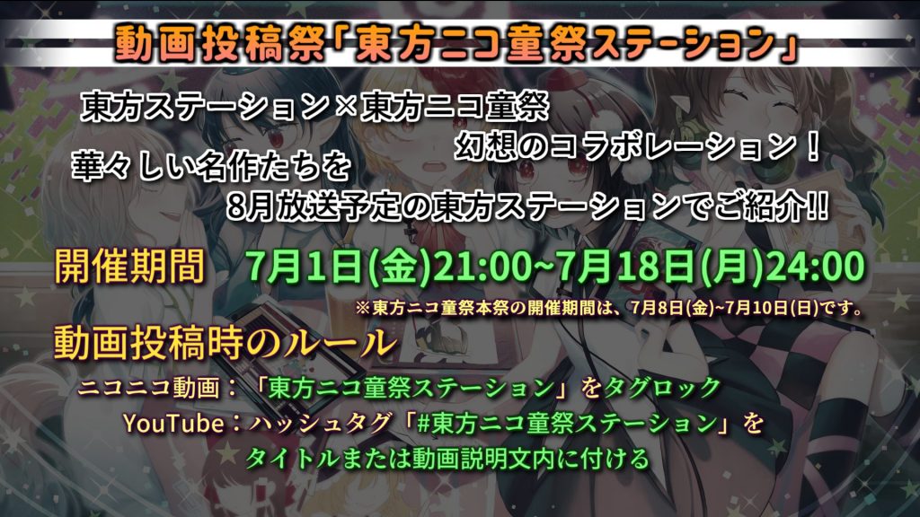 「東方ニコ童祭ステーション」は、YouTubeやニコニコ動画で東方Projectの二次創作動画を募集し、面白かった作品を東方ステーション内で取り上げよう!というコラボ企画。本放送は8月を予定しており、参加動画を募集中です。