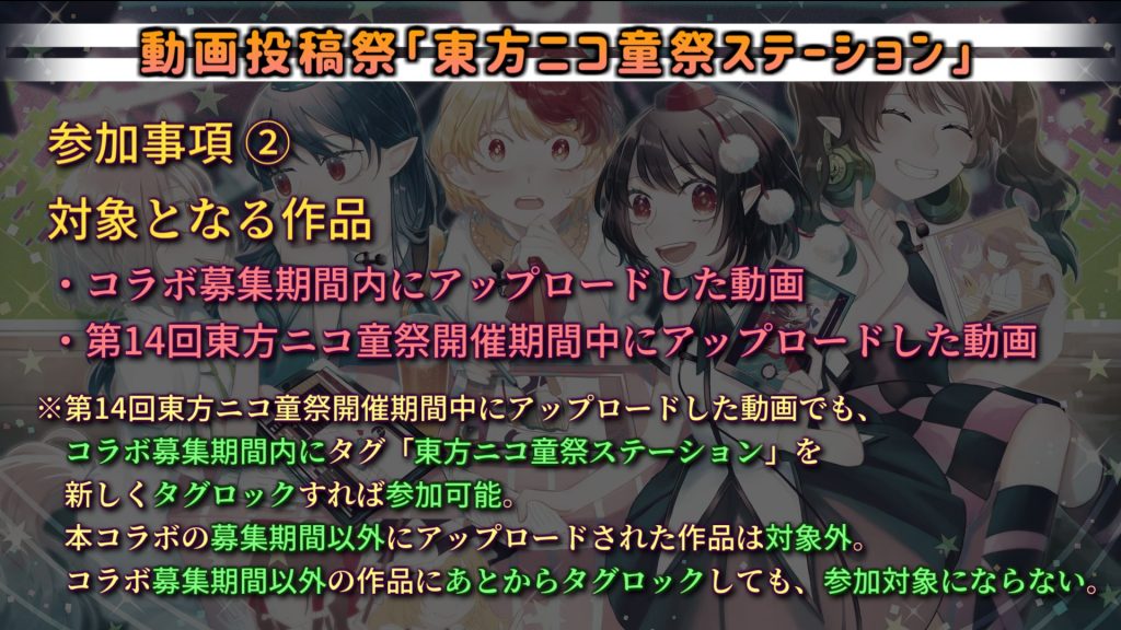 第14回東方ニコ童祭開催期間中にアップロードした動画でも、コラボ募集期間内にタグ「東方ニコ童祭ステーション」を新しくタグロックすれば、参加完了となります。