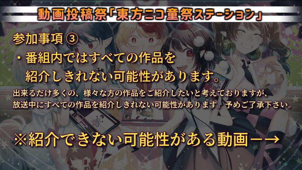 ※こちらの放送でも全ては紹介できない場合がございます。ご了承ください。その他ご不明な点がありましたら、東方ニコ童祭の「お問い合わせ」までご連絡ください。